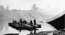 Before daylight on 4 April, the third battalion of the 100th Division's 398th Infantry Regiment slipped silently across the Neckar in assault boats a mile or so north of Heilbronn, starting from the suburb of Neckargartach.[3] As the men turned south toward the city after daybreak, a German battalion, using, in some cases, tunnels to emerge in the rear of the U.S. troops, counterattacked sharply. The ensuing fight forced the American infantrymen back to within a few hundred feet of the river. There they held, but not until another battalion of the 398th crossed under fire in late afternoon were they able to resume their advance. Even then they could penetrate no deeper than 1,000 yards (910 m), scarcely enough to rid the crossing site of small arms fire. Until the bridgehead could be expanded, engineers had no hope of building a bridge. Later on 4 April, General Burress of the 100th Division had the 397th Infantry Regiment cross the Neckar just south of the 398th's position.