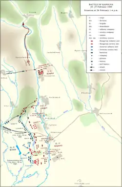 Dembiński made Tiszafüred his base of operations and intended to fight the decisive battle around Mezőkövesd and Eger.[4] The plan was that, before this, two divisions of the Hungarian army had to carry out a Demonstration (military) against the K.u.K. Brigade defending the city of Szolnok to divide the Austrian main army, by attracting there important enemy units.[7] Then the Hungarian main forces would advance along the Pest highway and cut off the Austrian forces trapped in the Szolnok area, and after the decisive victory around Kápolna and Eger, would liberate the capital.[7] However, Dembiński was so obsessed with his plan that he forbade even the effective pursuit of the isolated Schlik corps, on the assumption that if Schlik was severely defeated, Windisch-Grätz would not dare to move out from Budapest, and then his much-desired battle between Mezőkövesd and Eger would not be fought.[8] Dembiński intended to launch the attack in early March.[8] This explains why, when Klapka tried to attack Schlik's corps from two directions at Pétervására on 24 February, Dembiński ordered one of his columns back, and the desired success was again prevented by the commander-in-chief.[8] At the same time, Dembiński wanted to wait before attacking the main army, because János Damjanich's and Károly Vécsey's divisions would have arrived at Szolnok site by then, in order to carry out the planned diversionary attack, and until then he intended to take up a position along the Tarna river’s line with his main force.[9] But surprisingly, he did not wait for that to happen, and on the 24th he had already ordered his troops to advance.[9]
