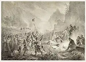 Among the English versions, Julian Kune/Kuné Gyula (1831-1914), a former Hungarian Honvéd and a fighter in the American Civil War, quotes an excerpt from the prayer text in his book Reminiscences of an Octogenarian Hungarian Exile, published in Chicago in 1911, entitled Kossuth's Prayer after the Battle of Kápolna.[37] In describing the Battle of Kápolna, the author compares many of its details to the Gettysburg Address which followed the Battle of Gettysburg (1863); showing that Kossuth, like Abraham Lincoln, consecrated the battlefield after the bloodshed with an unforgettable prayer.[37] The popularity of the prayer is indicated by the fact that woodcuts depicting Kossuth praying over the heroes at Kápolna were already being produced abroad in 1849.[32]