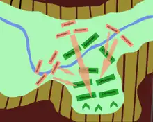 The Georgians launched their attack in the early morning of December 14, 1757. The advancing Ottoman army was concentrated and cornered where king Solomon wanted them. The assault was well prepared. Being smaller in size, the Georgian force had to compensate with a superior position, higher morale and determination in order to repulse the invading Turks. King Solomon personally led his army's charge, eventualy reaching Gola Pasha himself and reportedly decapitating him.[5] The Turks panicked and tried to escape. But their leader, Abashidze restored their moral and they returned to battle. However soon Abashidze was killed by Georgian soldier Gegela Tevdoradze (later he was called Gegelashvili). Seeing the death of their commanders, the Ottoman army finally started to rout enmasse and the Georgians proceeded to beat them. A large part of the Ottoman army was destroyed and captured, while some managed to escape. In the battle of Khresili, the commanders of the Ottoman force, Gola Pasha, Kemkha Pasha and Levan Abashidze were all killed.[6]