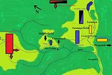 The Battle of Lesnaya (Russian: Битва при Лесной, romanized: Bitva pri Lesnoy; Swedish: Slaget vid Lesna; Polish: Bitwa pod Leśną) was one of the major battles of the Great Northern War. It took place on October 9 [O.S. September 28] 1708[lower-alpha 2] between a Russian army of between 26,500 and 29,000 men commanded by Peter I of Russia, Mikhail Mikhailovich Golitsyn, Aleksandr Danilovich Menshikov, Christian Felix Bauer and Nikolai Grigorovitj von Werden and a Swedish army of about 12,500 men commanded by Adam Ludwig Lewenhaupt and Berndt Otto Stackelberg, at the village of Lesnaya, located close to the border between the Polish–Lithuanian Commonwealth and Russia (now the village of Lyasnaya, south-east of Mogilev in Belarus). The Swedes were escorting a supply column of more than 4,500 wagons for their main army in Ukraine.