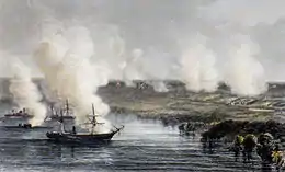 Union ships launching missiles onto the battlefield at Malvern Hill