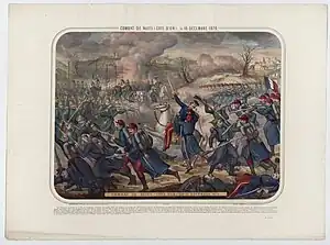 The Battle of Nuits-Saint-Georges was a battle in the Franco-Prussian War,[3] which took place on December 18, 1870.[12] In this battle, the Baden Division of Germany commanded by General Adolf von Glümer and the XIV Legion under the command of General August von Werder,[13] has won the position in Nuits from the French army led by General Camille Crémer,[10] forced the French army to withdraw overnight with heavy losses for both sides.[11] Glümer himself was also slightly wounded in this engagement, while the defeat of the French army in the fierce battle at Nuits Saint George resulted in the loss of much of their equipment to the German army.[6][14] Cremer is credited with fighting with great courage in this battle, but not with leadership.[15]
