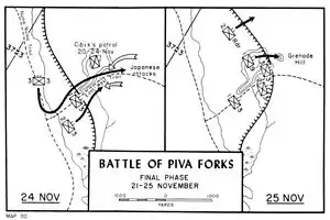On the morning of 20 November, the Japanese counterattacked and attempted to outflank the Marine positions along the Numa–Numa Trail. The attack was driven back, taking up positions and then harassed the Marines with sniper fire and mortar fire. The 3rd Battalion, 3rd Marine Regiment advanced towards the two forks of the Piva River to clear the threat, and two light tanks were disabled during the close fighting along the trail.[10] The 3rd Marine Raiders took up positions to cover the gap between the 129th Infantry Regiment and the 3rd Marine Regiment as the front expanded.[10]