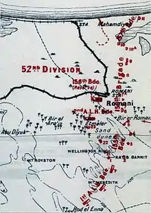 The 52nd (Lowland) Division developed a strong defensive position at Romani which had its left flank on the Mediterranean Sea, here a series of redoubts were built running southwards from Mahamdiyah along the line of high sand hills about 7 miles (11 km) to a dune known as Katib Gannit 100 feet (30 m) high. This line of sand hills, which were high enough to see Katia oasis from, marked the eastern edge of an area of very soft and shifting sand beyond which were lower dunes and harder sand where movement by both infantry and mounted forces was considerably easier. Between the shore at the western end of the Bardawil Lagoon and Katib Gannit (the principal tactical point on the eastern slopes of the Romani heights), the infantry constructed a line of 12 redoubts about 750 yards (690 m) apart, with a second series of redoubts covering the Romani railway station and the right of the defensive position which curved like a hook westward, then northward. A total of 18 redoubts were constructed, which when fully garrisoned held from 40 to 170 rifles each, with Lewis guns and an average of two Vickers machine guns allotted to each position; they were well wired on the right side of each of the positions, although there was no wire between the redoubts.[46] This defensive line was supported by artillery.[47][48]