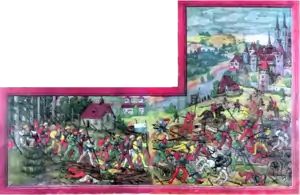 Depiction of the battle from the Chronicles of Lucerne (1511 1513). The Swiss arrive on the left; the battle itself is shown on the bottom right, and the top right shows the flight of the Swabian soldiers to Constance.