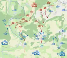The central ground assault was to be conducted by the 1st Panzer Division and supported by the Infantry Regiment Großdeutschland and the Sturmpionier-Battalion 43 (43rd Assault Engineer Battalion) as the 1st Panzer only had a single rifle regiment.[50] The Großdeutschland would be attached to the 1st Panzer Division for the remainder of the campaign[53] and it was the first unit to breach the defences on Hill 247, the high ground dominating Gaulier. The regiment, much to their surprise, discovered the Luftwaffe had failed to destroy the enemy bunkers. Enemy small arms fire ensured that crossing the river at Pont Neuf bridge could not be done in rubber assault boats as intended. The Regiment retreated. Reconnaissance found an enemy Bunker, No. 211, was still active. Its location guarded the bridgehead, making it dangerous for German infantry attempting a crossing. A platoon of infantry guns (75 mm short barrel artillery) failed to knock it out. An 8.8 cm FlaK dual purpose gun (88 mm) was brought in to do the job. It succeeded, but the following crossing failed as machine gun fire came from another flanking position that had not been spotted. Once this was dealt with by the 2nd Battalion, the remainder of the regiment crossed the river.[50] Throughout the rest of the day, the regiment moved up and into the French defences, the 2nd Battalion's 6th, 7th and 8th Companies gradually knocking out each bunker. Despite the other two battalions being held up further south, by 20:00 the central Hill 247 had been taken.[54] The Großdeutschland Regiment had now penetrated 8 kilometres (5.0 mi) into the French defences.[53]
