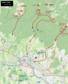 In the early hours of 13 May, the 10th Panzer Division slipped into position upstream to the north-east of Sedan, ready to strike at its designated crossing point near the town of Wadelincourt. Downstream, the 2nd Panzer Division moved into position to cross at Donchery. The 1st Panzer Division prepared to strike at the Gaulier bridgehead, near Floing, in the centre of Sedan's tactical front. It was on the northern bend of the Sedan-Meuse loop that the Luftwaffe was to make its maximum effort, between Gaulier and Wadelincourt. To supplement his air support, Guderian stripped most of his Panzer Divisions of their artillery, which he then positioned directly opposite Gaulier.[33] However, the artillery regiments lacked ammunition. Sustained and damaging bombardment through shelling was impossible. The Luftwaffe was going to have to do most of the work.[33] Guderian reported that his Corps had only 141 artillery pieces against the French 174.[6] To the north and south of Sedan, the French X Corps and French XXXXI Corps (at the artillery fortress at Charleville-Mézières) could also add their artillery and shell Guderian's Panzer units as they crossed the bridgeheads.[6] The slow advance of artillery units to the front added to the German numerical inferiority, which was now 1:3 against.[6] Only in the afternoon did the German artillery make an appearance, but with little effect. The 2nd Panzer Division was forced to attack without artillery support. For these reasons, Guderian had decided the outcome depended on the quality of air support, acting as flying artillery.[6]