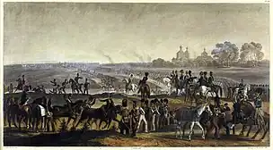 The Battle of Smolensk was the first major battle of the French invasion of Russia. It took place on 16–18 August 1812 and involved about 45,000 men of the Grande Armée under Emperor Napoleon I against about 30,000 Russian troops under General Barclay de Tolly.[1][4] Napoleon occupied Smolensk by driving out Prince Pyotr Bagration's Second Army. The French artillery bombardment burned the city to the ground. Of 2,250 buildings, 84% were destroyed with only 350 surviving intact. Of the city's 15,000 inhabitants, about 1,000 were left at the end of the battle inside the smoking ruins. With over 15,000 casualties, it was one of the bloodiest battles of the invasion.[5]