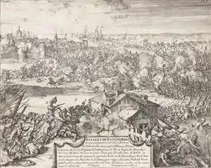 The Battle of Steenbergen, also known as the Capture of Steenbergen of 1583, took place on 17 June 1583 at Steenbergen, Duchy of Brabant, Spanish Netherlands (present-day North Brabant, the Netherlands). This was an important victory for the Spanish Army of Flanders led by Don Alexander Farnese, Prince of Parma (Spanish: Alejandro Farnesio), Governor-General of the Spanish Netherlands, over the French, English, and Dutch forces led by the French Marshal Armand de Gontaut, Baron de Biron, and the English commander Sir John Norreys, during the Eighty Years' War, the Anglo-Spanish War (1585–1604), and in the context of the French Wars of Religion.[1][2] The victory of the Spaniards ended the Treaty of Plessis-les-Tours, and Francis, Duke of Anjou (French: François de France), left the Netherlands in late June.[5][6]