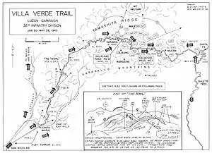 The Battle of Villa Verde Trail (Filipino: Labanan sa Tugaygayan ng Villa Verde) was a campaign by the United States Army and Filipino guerrillas in the Philippines during World War II in 1945 to force its way across the Caraballo Mountains from the Central Luzon plain to the Cagayan Valley. Somewhat to the surprise of the Americans, the Japanese had constructed strong defenses along the narrow and winding Villa Verde Trail, 27 mi (43 km) in length. The campaign began on 21 February 1945 and concluded with the success of the Americans on 31 May 1945. The U.S.'s 32nd Infantry Division, called the Red Arrow Division, carried out the campaign with assistance from Filipino guerrillas.