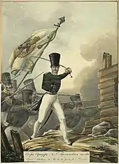 Forces under General Martinov assaulted the central wing of Fort 56. Here the obstacles were intact, and 200 Polish soldiers repelled three consecutive assaults by a famed Moscow Guards Regiment. The Russians lost two regimental commanders before their forces managed to reach the moat.[52] When a force of 2,900 Russians reached the top of the rampart, they were surprised by a staunch defence of a second rampart behind it.[15][52] Russian infantry retreated and hid under the first rampart. Biernacki, fighting in the northern wing, managed to expel the Russian infantry, but was killed in action during the counter-attack, and the Poles withdrew back into the trees on the far side of the fort. To stabilise the situation, General Sowiński ordered a company of the 8th Line Infantry Regiment to leave the central wing and join the fight in the north. The new commanding officer of the north wing, Maj. Lipski, organised yet another counter-attack. Shouting "Mates, remember Grochów, remember Iganie!" he led his men in a charge and pushed the Russians back once again, but the impetus was lost and the Russians retained control of the rampart to the north-west.[52] A short stalemate ensued, in which the Polish infantrymen and their single twelve-pounder carronade prevented much larger enemy forces from entering the fort.[15][52]