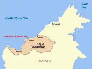 The Battle off Mukah was a naval engagement fought in May 1862 between boats of the Sarawak and pirates.[2] After the kidnapping of Sarawakian citizens some time before, two small gunboats encountered the pirates off Mukah on the northern coast of Borneo. In an unusual action, the Rajah Muda, Captain John Brooke, then the heir apparent to be White Rajah of Sarawak, led his force in the defeat of six pirate ships and the rescue of captured civilians.[3]