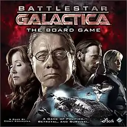 Battlestar Galactica: The Board Game is a board game created by Corey Konieczka and first published by Fantasy Flight Games[1] in 2008 based on the 2004 Battlestar Galactica series.[2] Players take the roles of characters from the series, trying to guide the Galactica and its fleet to its destination, while combating the Cylons and other crises threatening it. One or more players are secretly enemy Cylons, who win if the humans fail to achieve their objective.