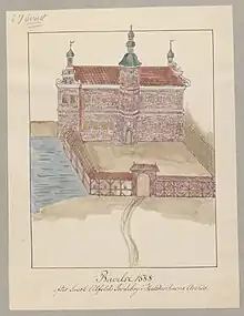 In 1562, Anne Jacobsdatter Flemming was married to Jacob Ulfeldt. In 1566, Jacob Ulfeldt inherited the estates Kongsbølle (later Ulfeldtsholm) on Funen and Selsø in Hornsherred. He is remembered for his very troubled diplomatic journey into Russia in 1578 during which he concluded an unfavourable treaty with Tsar Ivan IV (1530–1584) that brought him to disgrace at home. On his return to Denmark, he was thrown out of the privy council and lost all his royal fiefs. This prompted him to settle on his estates more permanently and he did much to improve their management. He increased their size through the acquisition of more land and constructed new main buildings. The new main building on the Bavelse estate was completed in 1588.[1] The building was most likely designed by Hans van Steenwinckel the Elder.