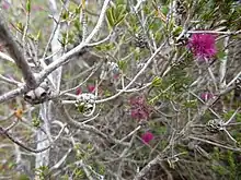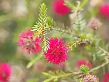The flowers are purple or purplish red and are arranged in bottlebrush-like spikes on the ends of branches which continue to grow after flowering. The flowering part of the stem is densely hairy and the flowers have 5 sepals, 5 petals and 5 bundles of stamens. The stamen bundles, which give the flowers their colour contain 3 to 7 (usually 5) stamens which are joined for about half their length. Flowering occurs from October to December or in January to February and is followed by fruit which are woody capsules in clusters about 12 mm (0.47 in) long .[2][3][4]