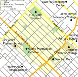 Beaufort Park is a park on the corner of Drummond and Beaufort Streets, which has a large grassed oval, a playground and a hall open for hire. During the summer, the oval is used for cricket, and has an artificial cricket pitch. In winter, there are two soccer pitches.[29] Grand Promenade Reserve is a park used for various sports. The oval is used for soccer and cricket, using an artificial pitch. The park also has cricket nets, courts for basketball and netball, and a playground.[30] Next to it is a lawn bowls club[31][32] and a community hall leased to the Filipino Australian Multicultural Association.[33] RA Cook Reserve is a sports reserve on Coode Street, used for cricket, Australian rules football, hurling, and softball. It has a turf pitch and two artificial cricket pitches, as well as cricket nets, and two Australian rules football ovals in winter. It is used by various sports clubs, and has a community hall for hire.[34][35] Other minor parks are spread throughout the suburb, including Alan Lehmann Reserve, Birkett Street Reserve, Browns Lake Reserve, Gummery Reserve and Remembrance Park.[36] The portion of Bedford used as public open space is less than the 10% recommended by the state government's liveable neighbourhoods policy.[36]