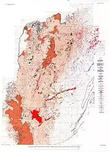 The Bedford Shale is present throughout much of eastern Kentucky.[32][33] It is thickest in north (in Lewis County), thinning out to extinction in Bath,[18] Estill, and Pike counties[34][lower-alpha 6] as it proceeds south and west.[18] It is about 100 feet (30 m) thick in Letcher and Pike counties,[36] which were closest to the Famennian deltas being deposited from the east and southeast.[37] The Bedford Shale essentially forms a great wedge underground, with the narrow edge in the southwest.[38]