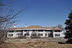Beech Hill is located on a hilltop just north of the town center of Dublin, on the west side of New Harrisville Road. Sited prominently near the crest of the hill is the main house, a sprawling two-story structure whose main section is covered by a hip roof. Its exterior trim includes corner pilasters and a dentillated cornice. The main block is extended by wings, including a more modern one that extends to one side of the swimming pool sited just east of the building.[3] The building is presently vacant and in deteriorated condition.