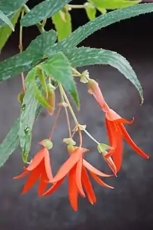 The stems of Begonia boliviensis spring from a tuberous root-stock, and attain a height of between 12 inches (300 mm) and 18 inches (460 mm); the flowers, produced in pairs or threes on short stems in the angles of the obliquely lanceolate leaves, are bright orange/pink in colour, composed of four pointed segments.