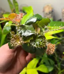 Begonia ferox is a species of flowering plant in the family Begoniaceae.[1] Begonia ferox has been documented in Guangxi Zhuangzu growing on limestone outcroppings of the forest floor. It has a creeping growth habit, with leaves up to 19 cm (7.5 in) long and 13 cm (5 in) wide. When the leaves reach maturity, blackish-brown and hairy bullae with red tips emerge, up to 1.3 cm (.5 in) tall and .6 cm (.25 in) wide. It flowers from January through May, producing fruit April through July. Carpellate flowers are pinkish white, while staminate flowers are pinkish yellow, and the fruit is reddish-green.[2]