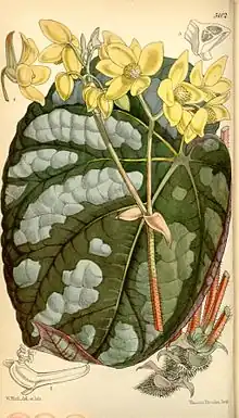 Begonia xanthina is a species of flowering plant in the family Begoniaceae, native to the eastern Himalayas, Assam, and southwestern Yunnan in China.[1] A rhizomatous geophyte reaching 40 cm (16 in), it is typically found growing near streams on rocky forested hills up to 800 m (2,600 ft) in elevation.[2] It resembles Begonia rex, but with yellow flowers and scattered light green splotches on the leaves.[2]