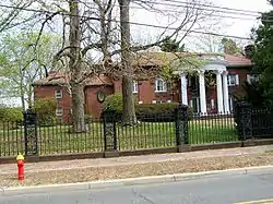 Beleden House is located in Bristol's Federal Hill neighborhood, one of its most fashionable addresses in the early 20th century. It stands on the east side of Bellevue Avenue, between Session Street and Beleden Gardens Drive. It is a two-story masonry structure, built out of orange brick and covered by a hip roof. It has a U-shaped plan, with a service wing extending north from the northern leg of the U. The front facade is dominated by a two-story half-round four-column Ionic portico. The building corners are finished in brick pilasters that echo those of the portico. The interior of the U is a palm court, whose eastern bound is an arched colonnade. The interior of the house is lavishly appointed with fine woodwork and multiple types and colors of imported marble, and includes a music room with organ.[2]