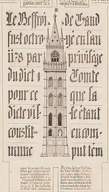 Miniature of the belfry in the 19th century. Excerpt from the manuscript "Gand et Flandre" with chronicles, maps, miniatures and monuments. Written by Bruno Christiaenssens, 1844.[2]