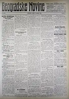 The Belgrader Nachrichten (Serbian: Beogradske Novine, lit.'Belgrade News'), was the official occupation periodical of the Austro-Hungarian Military Governorate in Serbia during the First World War. As the main propaganda organ, the focus of the newspaper was to portray the occupation and its government as benevolent and working in the interest of the Serb population. It was published daily, in German, Serbo-Croatian and Hungarian from 1915 to 1918, during the occupation of Serbia.[1]