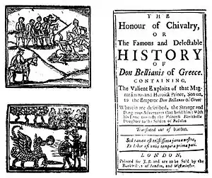 Belianís of Greece is the eponymous hero of a Spanish chivalric romance novel, The honour of chivalry,[1] following in the footsteps of the influential Amadis de Gaula. An English abridgement of this novel was published in 1673. It is best known today because it was one of the books spared during the expurgation of Don Quixote's library in Chapter 6 of Part I of Don Quixote.