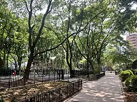 Bellevue South Park is a 1.59-acre (0.64 ha) public park in the Kips Bay neighborhood of Manhattan, New York City.[1] Located on the west side of Mount Carmel Place between East 26th and 28th streets, the park was originally planned as part of the Bellevue South Urban Renewal Area approved by New York City in 1964. The park did not open until 1979 due to a lack of municipal funding during the city's fiscal crisis and local community groups were originally responsible for the park's upkeep before maintenance was transferred over to the New York City Department of Parks and Recreation in 1986.