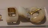 Belt buckles go back at least to the Iron Age and a gold "great buckle" was among the items interred at Sutton Hoo. Primarily decorative "shield on tongue" buckles were common Anglo-Saxon grave goods at this time, elaborately decorated on the "shield" portion and associated only with men. One such buckle, found in a 7th-century grave at Finglesham, Kent during excavations by Sonia Chadwick Hawkes in 1964 bears the image of a naked warrior standing between two spears wearing only a horned helmet and belt.[1]