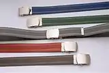 Earlier, military-style buckles often use friction and are designed for use with cloth belts or straps. Simple friction buckles are one-piece frames with no prong whatsoever, the strap or belt winding through a series of slots, and may more technically be called "belt slides" or "belt trims." Although technically not buckles, other fasteners such as plastic "side-clasp" or even seat belt latches are also often used on belts, and colloquially called buckles.