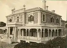Database entry: Two storey slate roof Victorian Italian style, stone with rendered dressings, Corinthian porch and verandah with cast iron ornament - central feature surmounted with heavy pierced parapet and elaborate urns. Rear sections appear to be later additions - high stone brick capped garden wall with wrought iron gates, rooms behind wall appear to be later additions.