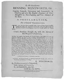 Benning Wentworth (July 24, 1696 – October 14, 1770)[lower-alpha 1] was an American merchant and colonial administrator who served as the governor of New Hampshire from 1741 to 1766. While serving as governor, Wentworth is best known for issuing several land grants in territory claimed by the Province of New Hampshire west of the Connecticut River, which led to disputes with the neighboring colony of New York and the eventual founding of Vermont.
