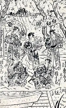 ![]() Woodblock printed playbill image from the March 1862 premiere at the Ichimura-za theatre in Edo, featuring actors Ichimura Uzaemon XIII (top/left), Nakamura Shikan IV (bottom/left), Seki Sanjūrō III (center), Iwai Kumesaburō III (top/right) and Kawarazaki Gonjūrō I (bottom/right). | |