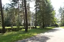 The perpetrators acted in such hurry that they did not dispose of the bodies, just forced some temporarily spared prisoners to pick up the corpses on the road and throw them into roadside ditches.[28] It was only the next day that a special NKVD commando appeared at the site of the massacre and forced the kolkhozniks (collective farmers) from Taklinovo to collect the bodies of the murdered and bury them in five potato pits located in the nearby forest. After the Wehrmacht occupied this area, the victims of the massacre were exhumed and then buried in a large mass grave dug at the edge of the forest.[33]