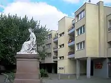 The Peace Column (German: Friedenssäule) is a column located in Mehringplatz in Berlin, Germany. Designed by Christian Gottlieb Cantian and erected in 1843, the 19-meter column is topped with a brass statue of Victoria, goddess of victory, designed by Christian Daniel Rauch. In 1876, allegories of the four victorious allies of Waterloo (or Belle Alliance in Prussian historiography) were added, and in 1879 two more sculptures followed: The Peace by Albert Wolff and Clio, writing the history of the Wars of Liberation (Befreiungskriege) by Ferdinand Hartzer.