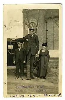 Bernard A. Coyne (July 27, 1897  May 20, 1921)[1] is one of only 20 individuals in medical history to have stood 8 feet (240 cm) or more. Coyne may have reached a height of 8 feet 4 inches (2.54 m) tall at the time of his death in 1921. His World War I draft registration card, dated on August 29, 1918, lists his height as 8 feet (240 cm). The Guinness Book of World Records stated that he was refused induction into the Army (1918)[2] when he stood at a height of 7 feet 9 inches (236 cm).