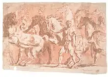 Between 1550 and 1555, he worked with Eliodoro Forbicini on two rooms on the ground floor of the Palazzo Canossa in Verona, decorating them with Olympic divinities and grotesques, an extravagant style of ancient Roman decorative art rediscovered at Rome at the end of the fifteenth century and subsequently imitated. In 1552, India moved to Vicenza to decorate the palace that Marcantonio Thiene had just had built by Andrea Palladio.[1]