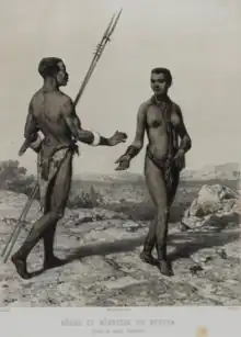 In their wedding ceremonies, music is played by males with large calabash trumpets (waz'a).[4][5] The groom arrives to the wedding on a donkey and carrying a bang (throwing stick) in his hand. After the wedding, the husband has to build a hut and live in his wife's village for a year or more, tilling his father-in-law's land. Divorce is accepted. The Berta practice scarification, usually three vertical lines on each cheek, which they consider to be symbols of God (each line is interpreted as the initial letter of Allah, the Arabic alif).