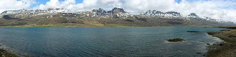 Berufjörður (Icelandic pronunciation: [ˈpɛːrʏˌfjœrðʏr̥] ) is a fjord in Eastern Iceland. It is about 20 kilometres (12 miles) long and 2 to 5 kilometres (1.2 to 3.1 mi) wide. The village Djúpivogur (pop. 456) is located on its western shores. Mt. Búlandstindur which is 1,069 metres (3,507 feet) above sea level is located west of the fjord.[1] Route 1 passes on its shores.