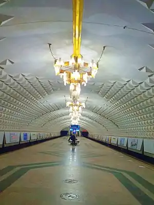 Beruniy is a station of the Tashkent Metro, it is the northwestern terminus of the Oʻzbekiston Line. The station was opened on 30 April 1991 as part of the extension of the line from Chorsu to Beruniy.[1] The station is designed in national traditions of Uzbekistan: the platform hall is decorated by a dome covered with marble patterns. The plant has crystal chandeliers, with all - in the lobby, in the walls of the stairs and in the hall are made in the same style (painter S. Jalilov). Interior wall decoration station is made with marble, granite, metal, glass, porcelain.
