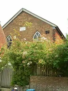 Bethel Chapel is "an excellent example of the unobtrusive good taste of the Strict Baptists' chapel style",[21] and its "quaint" appearance[10] contrasts with the "very Victorian", "rich and fruity" neighbouring Congregational Church of 1881.[22][23] Weller's chapel was built in 1842,[24] as indicated on the carved stone tablet placed high on the west-facing gable.[25] This elevation is of red brick and has two wooden-framed windows with pointed arches containing y-tracery.[20][24][25] The sides of the building are hung with red tiles,[25] and the roof has slate tiles. The entrance is set below a gabled hood mould.[20]