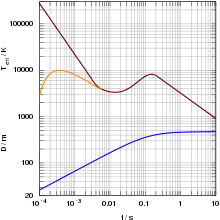 Graph of a nuclear fireball's surface temperature and diameter over time