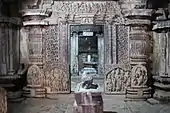 The outer wall of the temple has projections and recesses creating niches. In these niches are miniature decorative towers in relief (called aedicula or turrets), the execution of which evolved during the Later Chalukya rule. The vesara style aedicula are supported by double pilasters while the dravida (south Indian) style aedicula are supported by single pilasters. The art historian Percy Brown calls the Later Chalukyan style of wall decoration "exceptionally well rendered", and according to Kamath, the miniature towers are wrought in a "most artistic refrain".[5] Each tier of the superstructure has a kirtimukha (gargoyle like face). Below each kirtimukha, is a relief of a deity such as the Nataraja or Maheshvara (both forms of the Hindu god Shiva). Worthy of mention is the ornate relief on the lintel and door jamb at the entrance to each sanctum (garbhagriha) which exhibit Saiva dvarapalas ("guardians" to a shrine of the god Shiva) flanked by female umbrella (chauri) bearers. Facing the west sanctum is a small sculpture of Nandi the bull. There are sculptures of various deities from the Hindu pantheon in the niches in the interior wall of the temple, such as Ganesh (elephant headed god of "beginnings" in Hinduism), Mahishasuramardhini (a form of Durga) and the Saptamatrika (the seven Hindu goddesses). The ceiling in the common hall is supported by four polished lathe turned pillars, which according to Kamath is also a characteristic feature of Western Chalukya temples.[4]