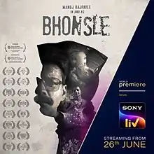 Bhonsle premiered in the 'A Window on Asian Cinema' section of the 2018 Busan International Film Festival and was also screened in the non-competitive India Story section at the MAMI Film Festival, the 2018 Dharamshala International Film Festival, the 2019 International Film Festival Rotterdam, the Bengaluru International Film Festival and the Singapore South Asian film festival.[4][5][6][7][8][9] It won the Best Screenplay and Best Director Award at the Asian Film Festival Barcelona.[10] It was released on SonyLIV on 26 June 2020.[11] Manoj Bajpayee won the National Film Award for Best Actor at the 67th National Film Awards.