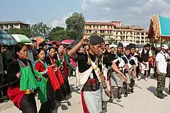 Bhume Naach (also known as Bal puja) is one of the festivals celebrated by the Kham Magar people from Lumbini and Karnali provinces of Nepal.[1] The term Bhume means 'Earth' and Naach means 'dance' in the Nepali language. The Kham people practice a religion that worships the land (bhumi puja), water sprouts (shim), forests (ban puja) and weather, asking for better crop yields and cattle.[2]