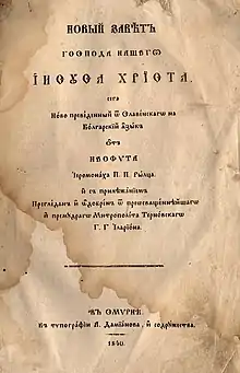 - ↑ The title page reads: “The New Testament of Our Lord Jesus Christ. Now newly translated from Slavic into Bulgarian language by Neofit, Ieromonah P.P. of Rila. And diligently examined and approved by the very consecrated and wise Metropolitan of Tarnovo, Illarion. In Smyrna. In the Press of A. Damianov and Company. 1840.”