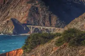 The Big Creek Bridge is a 589-foot (180 m)-long, open spandrel, concrete deck arch bridge located on the southern portion of the Big Sur coast of California, along State Route 1 near Lucia. Opened for traffic in 1938, it crosses Big Creek Canyon on this scenic, mountainous coast.